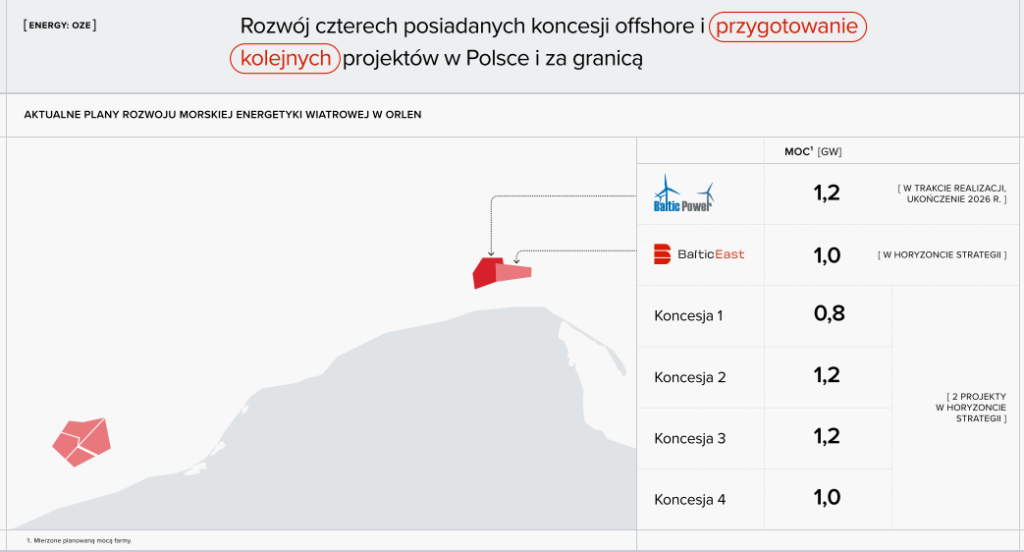 Przedstawiciele koncernu energetycznego Orlen zaprezentowali 9 stycznia 2025 r. nową, „ambitną i odpowiedzialną” strategię biznesową „Energia jutra zaczyna się dziś”. W planach polskiego inwestora jest rozwój m.in. czterech morskich farm wiatrowych. Inwestor obecnie jest na etapie rozmów z potencjalnymi partnerami, ale nie podał jak na razie szczegółów. Koncern planuje zwiększenie wydobycia gazu, rozwój wielkoskalowych magazynów energii oraz minimum dwóch małych elektrowni jądrowych (SMR). Strategia do 2035 r. zakłada łączne nakłady inwestycyjne do 380 mld zł.