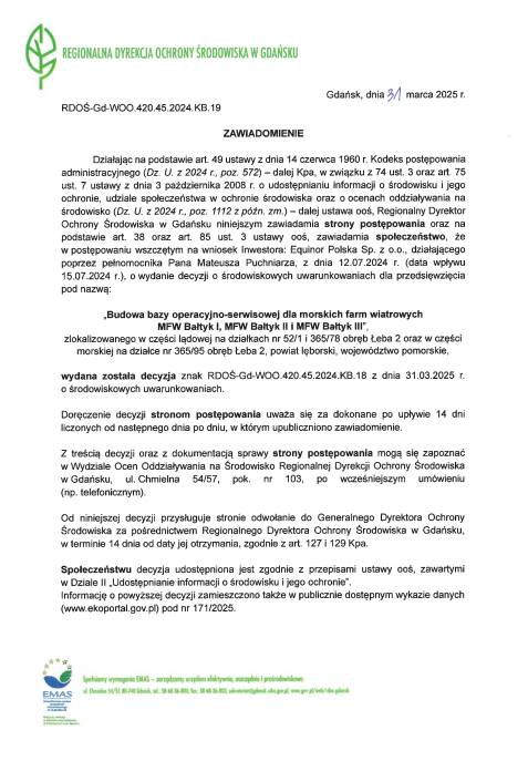 Decyzja o sygnaturze RDOŚ-Gd-WOO.420.45.2024.KB.18 została wydana 31 marca 2025 r. na wniosek inwestora Equinor Polska Sp. z o.o., który działał poprzez pełnomocnika Mateusza Puchniarza. Postępowanie w tej sprawie zostało wszczęte 15 lipca 2024 r.