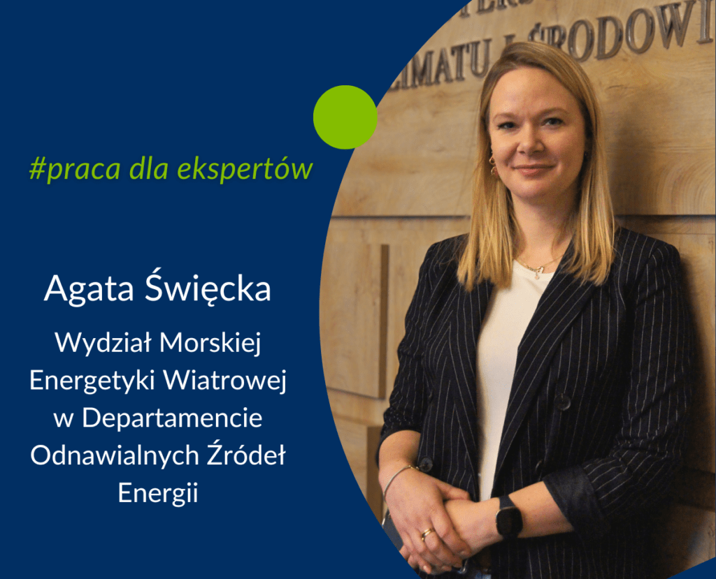 Obecnie jestem naczelniczką Wydziału Morskiej Energetyki Wiatrowej w Departamencie Odnawialnych Źródeł Energii. W Ministerstwie Klimatu i Środowiska pracuję od dwóch lat. Ja i mój zespół zajmujemy się rozwojem i przygotowaniem ram legislacyjnych dla morskiej energetyki wiatrowej po to, aby pierwsze farmy wiatrowe w naszej części Bałtyku powstały.