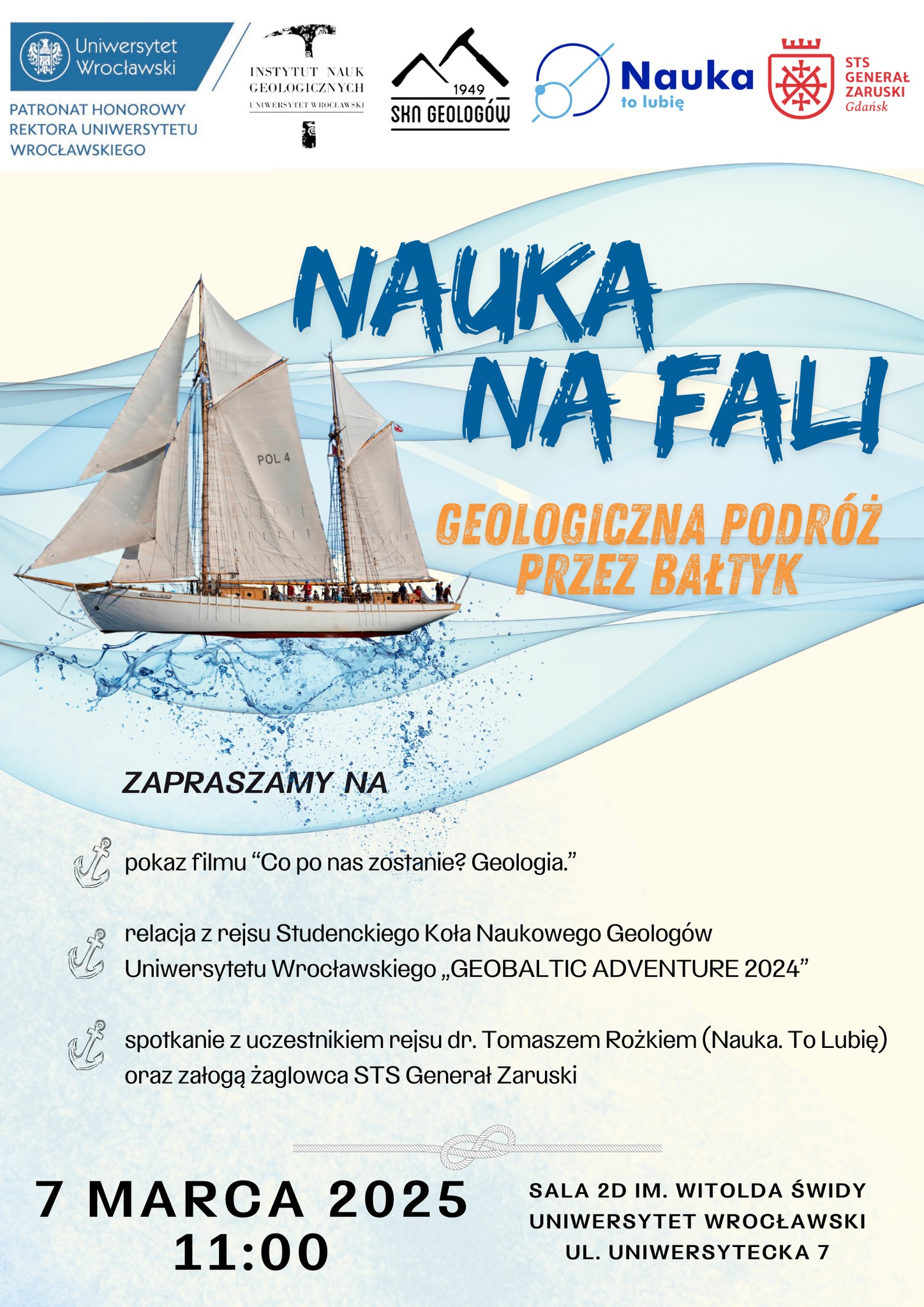 Przypomnijmy, że w dniach 4-15 sierpnia ubiegłego roku Studenckie Koło Naukowe Geologów UWr wzięło udział w rejsie „GeoBaltic Adventure – Sailing Through Time” po Bałtyku. Pod patronatem Rektora UWr prof. Roberta Olkiewicza oraz fundacji Nauka. To Lubię, studenci badali geologię bałtyckiego wybrzeża od prekambru po współczesność, a jednocześnie doskonalili umiejętności pracy zespołowej. Wśród 25 uczestników znalazł się także dr Tomasz Rożek, ceniony popularyzator nauki.